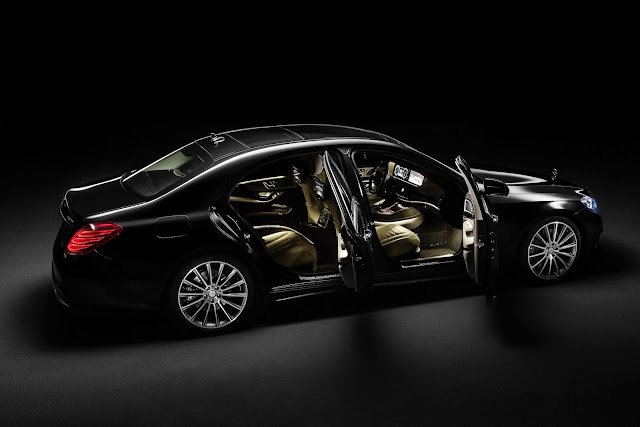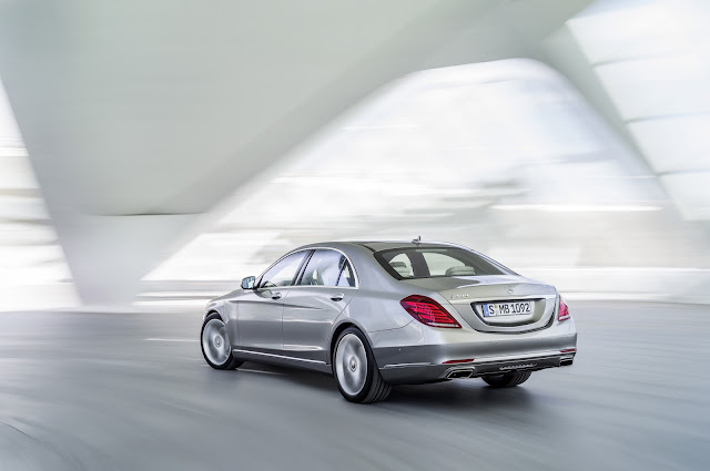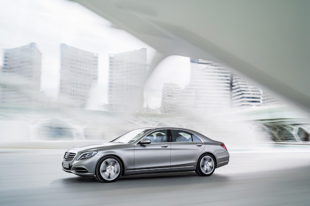 The new S-Class has an extremely low drag co-efficient of 0.24Cd. It's also the first car in the world that doesn't have a single lightbulb on board - instead it has 56 LEDs in each headlamp, 35 in each tail-lights, 4 in the fog lamps and 300 inside.