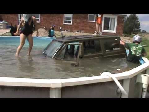 I think the intention here was to demolish the pool but the Jeep jumped and the pool survived! So they had to get out a saw to cut the Jeep out.