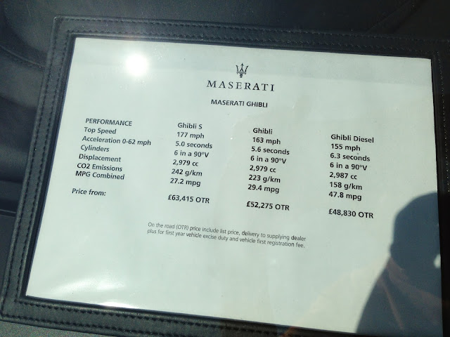 I also took a photo of the spec and price list (bottom photo), although the prices have been guesstimated by Maserati UK based on Italian prices. Still, at £48k-63k the pricing is spot on and makes the Ghibli a real contender for the A6, E-Class, 5-series and XF.
